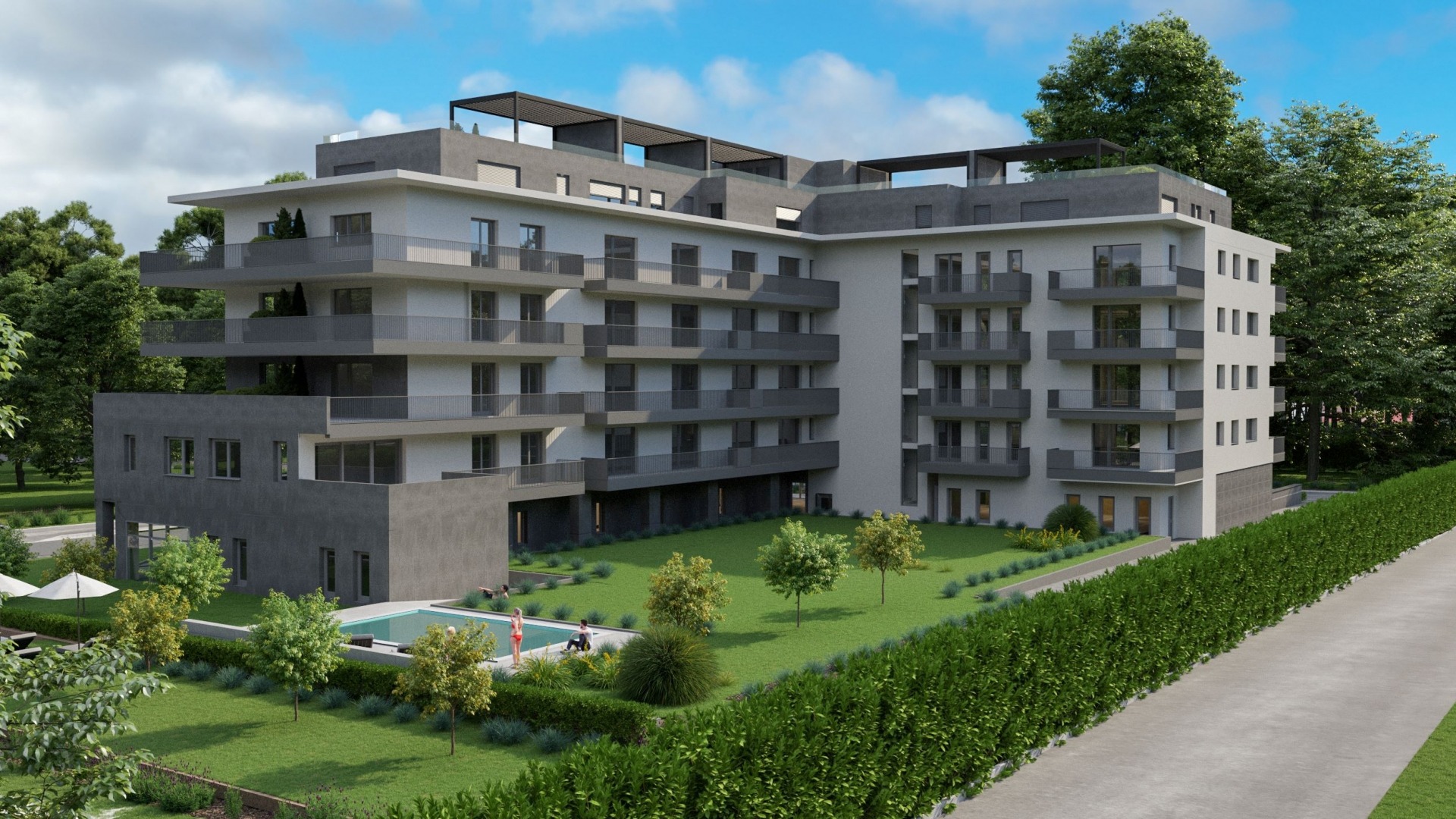 A hatalmas parkosított kert és kültéri medence biztosítja a lakók nyugodt pihenését. A magas színvonalú, modern, energiatakarékos hőszivattyús fűtés- és hűtésrendszerrel, valamint igényes gépészettel felszerelt lakások minden mai elvárásnak megfelelnek. A lakások mellé kötelezően megvásárolandó 1 db garázshely és 1 db tároló.